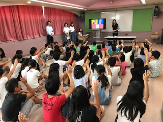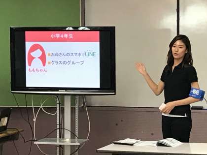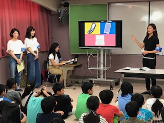大阪府警察本部と協働で、大学生ボランティアが講師となり、防犯教室を実施しています。関西外国語大学のボランティア団体・ひまわりから、久保田さん、水谷さん、海原さん、中尾さんが講師をやっていただいてます。