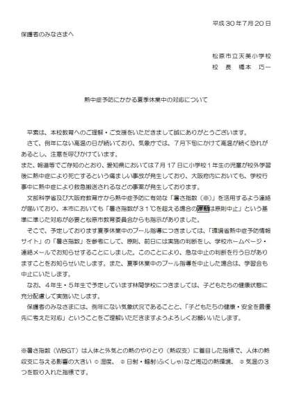7月20日 熱中症予防にかかる夏季休業中の対応について