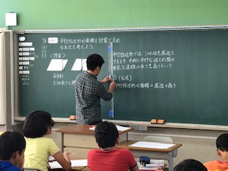 これまで習った、三角形や長方形の面積の求め方などを活用して、平行四辺形の面積をまとめます。「考える算数」の単元です。