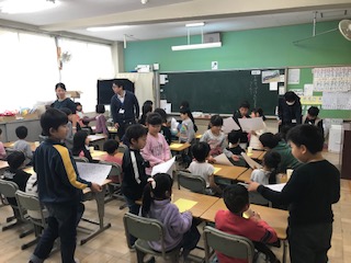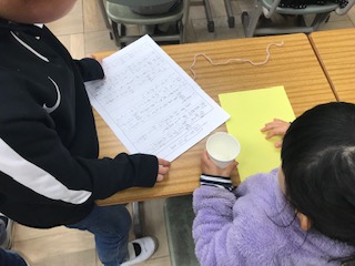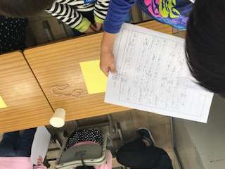 2年生が、けん玉の作り方を作文にまとめました。それを使って、けん玉をつくる指導をしています。