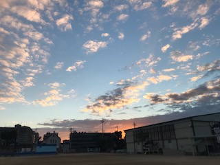 校長からの講話。今日のクイズは、今朝の天美小学校の写真。一枚目の写真を出して、「どこの写真?」とたずねると、「きれい!」というつぶやきの間から「天美小学校」というかすかな声が。