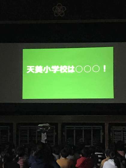 今日のテーマ1として、11月に披露したプレゼン「天美小学校は◯◯◯」を出すと、子どもから「きれい」の声がかえってきました。