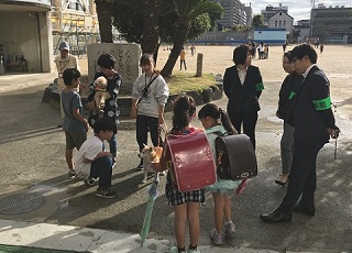 今日の朝、正門前に素敵なゲストが子どもたちを迎えてくれました。犬のお散歩中に子どもたちの安全を見守ってくださる「わんわんパトロール」のみなさんと松原警察のみなさんです。かわいいわんちゃんにであって、子どもたちも大喜び。このように、地域で活動してくださる方がおられるということを知らせていただけて、感謝します。