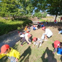 どんぐりひろいをしています。いろんな形のどんぐりを見つけて叫び声をあげて喜んで拾...