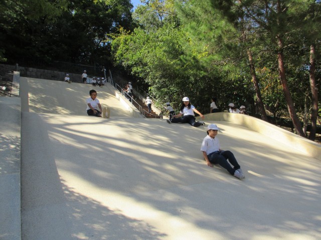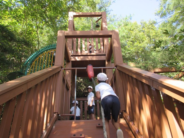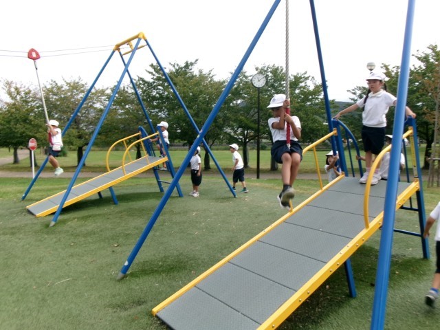 電車から降りて山道を声をかけ合いながら歩きました。公園に到着後、疲れたかなと思いきや、アスレチックが見えたらみんなとびつくように走って遊びに行きました。