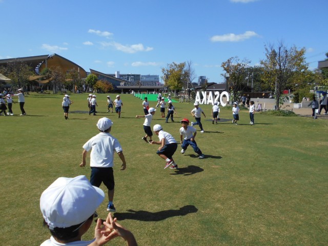 お弁当とお菓子を食べた後は、芝の上を走り回ったり転がったりして、自然と親しめた一日になりました。