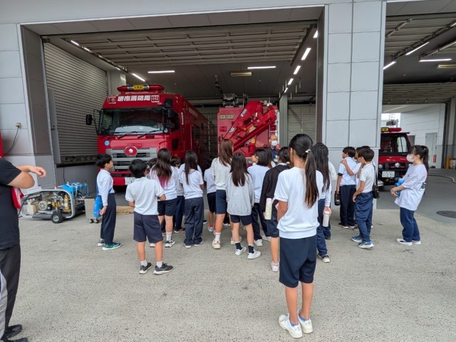 堺市総合防災センターで、消防車や救急車に乗せてもらったり、地震体験、消火体験をさせてもらったりしています。雨が降っていますが、子どもたちは元気いっぱいです。