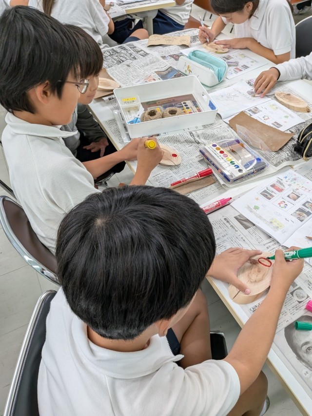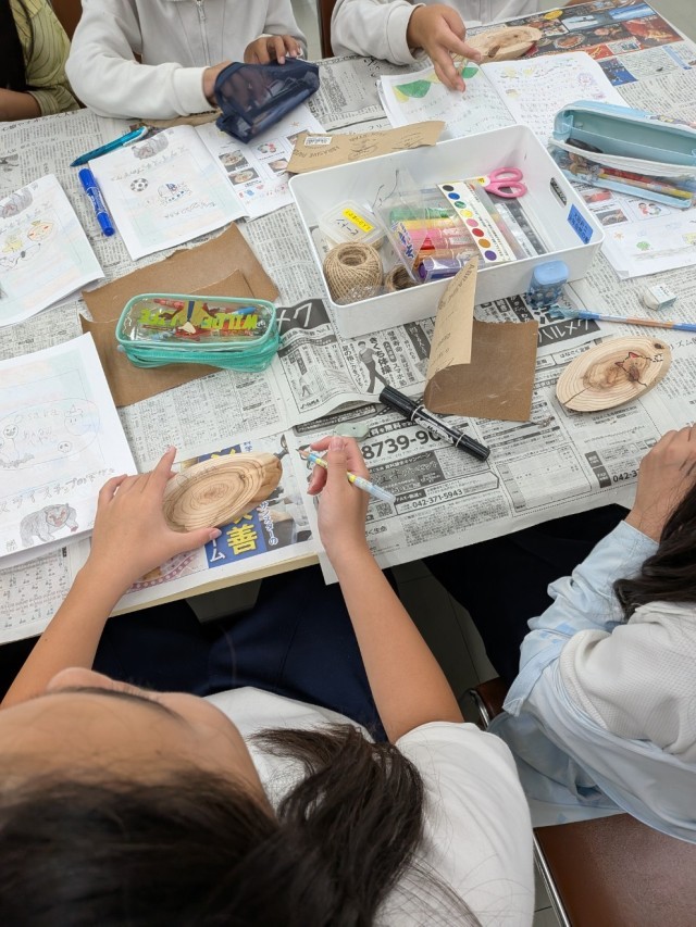 宿舎に到着しました。子どもたちは、スライスチップという飾りを作っています。慎重に絵を描いたり字を書いたりしています。