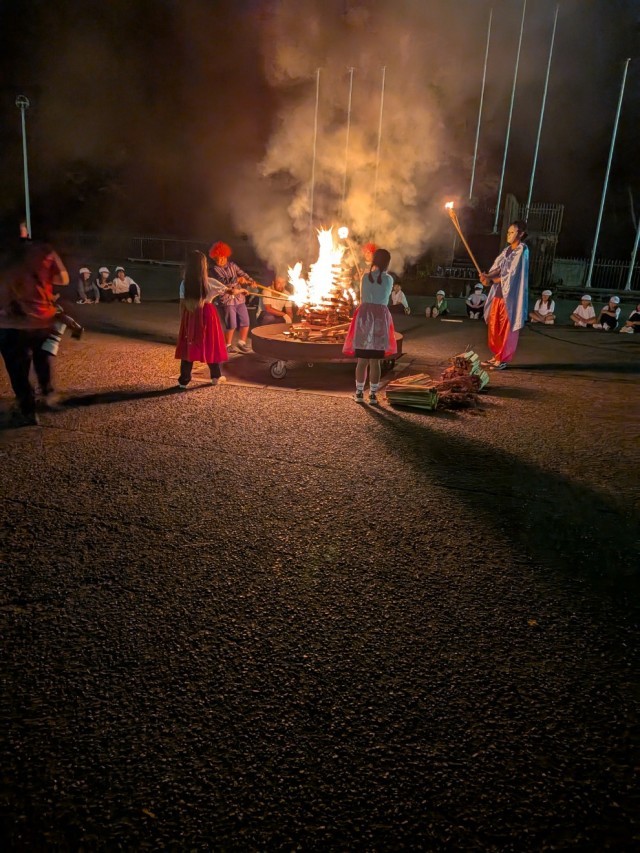 火の神が現れて、無事、火がつきました。子どもたちが考えたゲームで楽しんでいます。