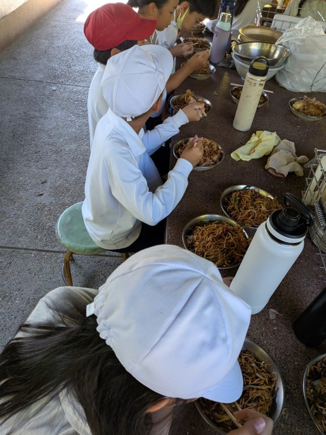 お昼ご飯の焼きそばを作りました。どの子どもも大活躍。野菜が嫌いな子どもも、がんばって食べました。片づけもバッチリ。素晴らしい活躍でした。ご苦労様でした。