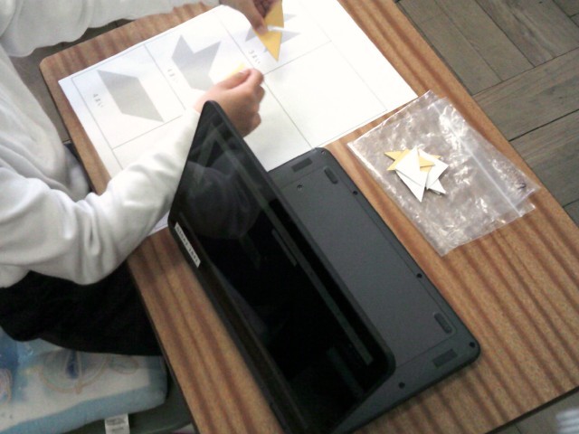 今日の算数の時間は、同じ大きさの三角形をしきつめて、いろいろなシルエットを完成させる活動をしました。