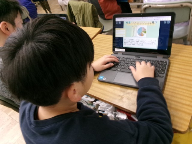 社会の時間では、調べ学習を行っています。一人ひとりが、調べたデータを文章化したり、グラフ化したりしてまとめをしていました。5年生、とても情報活用スキルが高まっています。