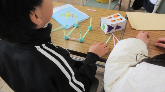 2年生は算数で「はこのかたち」の学習を進めています。今日は、ストローと粘土玉を使い、箱の骨組みを2人ペアで作りました。どのペアも声をかけあい協力しながら、きれいな骨組みをつくることができました。最後に...