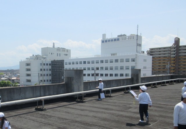 3年生は、社会の時間に方角の学習をしています。布忍小学校から見て、東西南北の方角には何があるかを実際に見るために西館の屋上に行きました。「東にハンズマンが見える!」「北の方にあべのハルカスがある!」と...