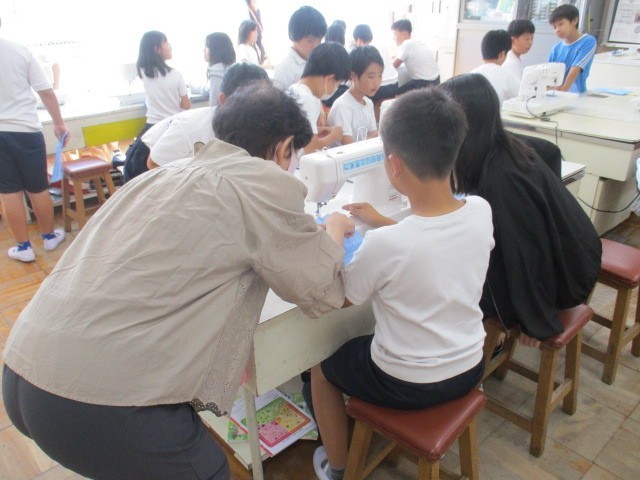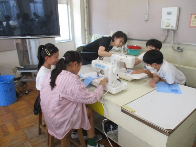 5年生の家庭科では、ミシンを使って縫物の練習をしています。