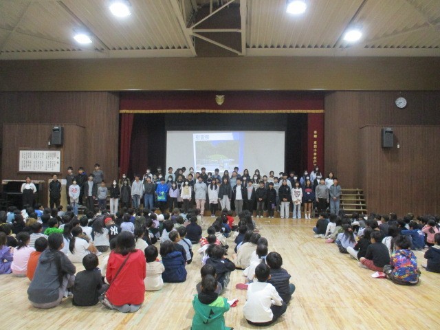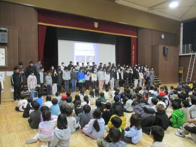 今朝の児童朝会では、自分たちが学んだことを後輩たちに向け、一生懸命伝えていました。