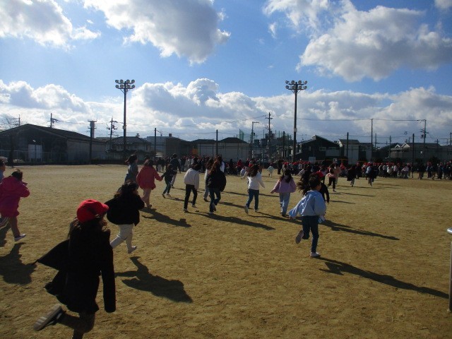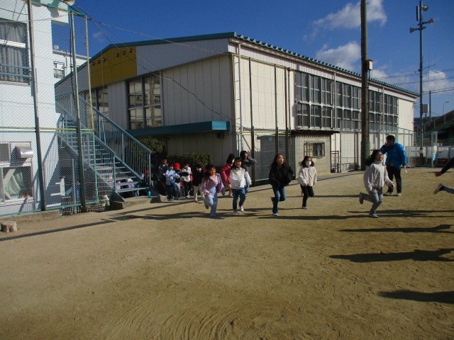 運動場で遊んでいた子どもたち、教室にいた子どもたちが一斉に運動場に避難しました。