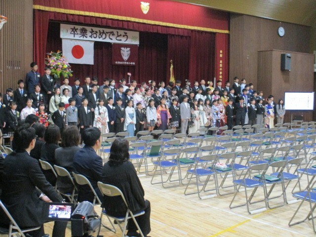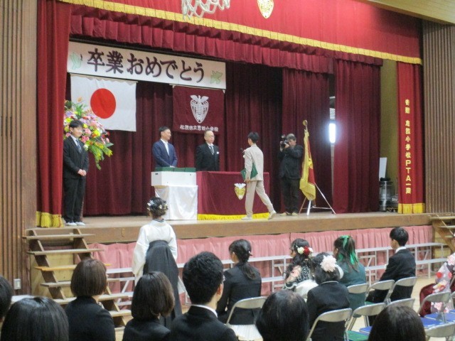 卒業生一人ひとりに卒業証書を渡しました。一人ひとりの顔を見て、その胸に去来するものが何かを想像しながら渡していました。ニコニコと喜びにあふれた笑顔、少しはにかんだ恥ずかしそうな笑顔がある一方、緊張からか硬い表情の子どももいました。でも、間違いなく一人ひとりが恵我小学校での6年間の思い出を胸に証書を受け取ってくれていたと思います。