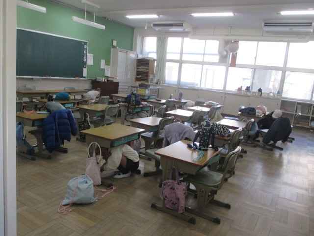 休み時間中に地震が起きたと想定して「自分で自分の身を守る」意識や行動を訓練を通して身につけるよう行いました。
