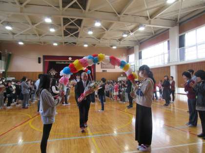 この春、三宅小学校を去られた先生方をお迎えして、離任式を行いました。代表の児童から、お世話になった感謝の気持ちを込めて花束をお渡しし、一緒に校歌を歌いました。