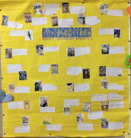 図書室前の掲示板には、色々な本が紹介されています。「三宅っ子からのおすすめの本」のコーナーもあります。図書室の中には先生方のおすすめの本の紹介もあります。これから、どんどん夜が長くなっていきます。外から帰ってから、図書室から借りてきたお気に入りの本をじっくりと読んでみましょう。