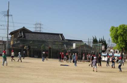 (上)久しぶりに良い天気で、朝から運動場には、元気に遊ぶ三宅っ子の姿!