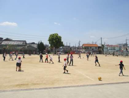 快晴の下、元気に運動場をかけまわって遊ぶ三宅っ子。