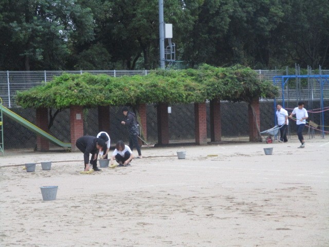 雨のため、運動場がぬかるんでいます。現在、職員で水たまりの整備や整地等の作業を行っていますが、服や靴などが汚れる可能性もります。