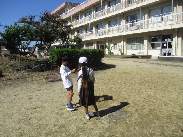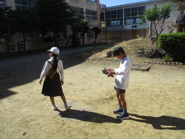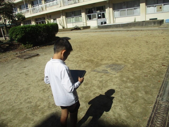 タブレットで影を撮って、どちらの向きに影ができているのか、どのように影ができているのかを確かめていました。