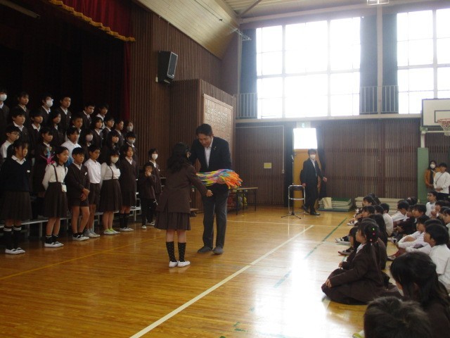 全校児童が折った折り鶴を千羽鶴にして、持って行きます。