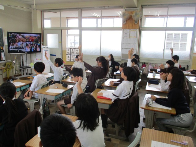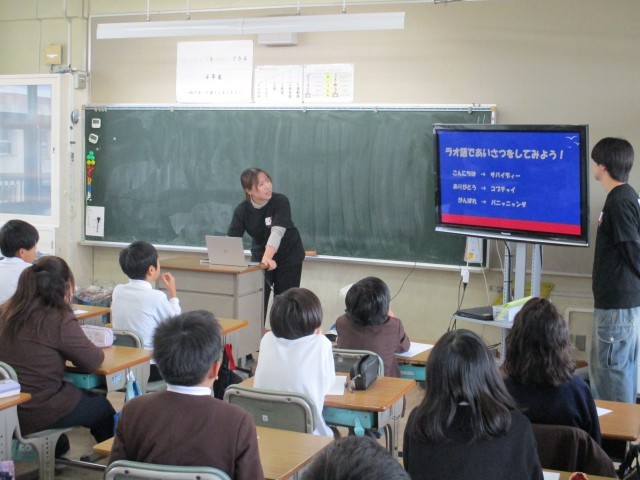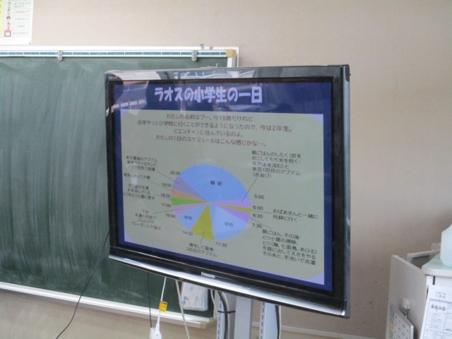 4年生の総合的な学習の時間では国際理解学習を行っています。11月5日に学生団体の「I-RIS」の方たちをお迎えし、アジアの国の一つのラオスについての話や、その中の活動についての話を聞き取りしました。