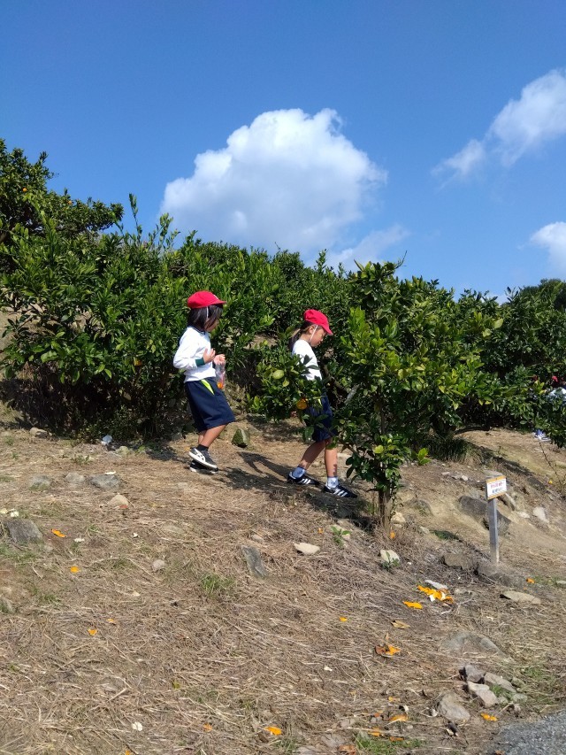 急斜面に手こずりながらも、みかん狩りを楽しんでいます。