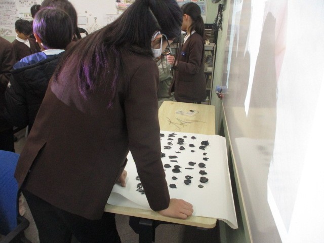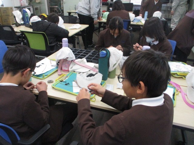 見学していないグループは、待っている間、金属で作ってもらったキャラクターと自分のイニシャルでキーホルダーづくりをしました。