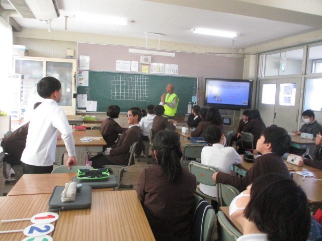 松原市防災士会の方に来ていただき、大きな地震が起こった時にどう対処するのか、どう避難するのかを教えてもらいました。