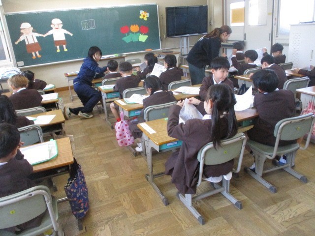 上の会話は、プリントを配る時の言葉です。先生が、「はいどうぞ。」と前の子にプリントを渡します。渡された子は、「ありがとう。」と言ってプリントを受け取ります。そして、後ろの子に「はいどうぞ。」と渡します。後ろの子は「ありがとう。」ともらいます。ただプリントを渡すだけだけれど、「はいどうぞ。」「ありがとう。」でずいぶん気持ちよくなりますよ。
