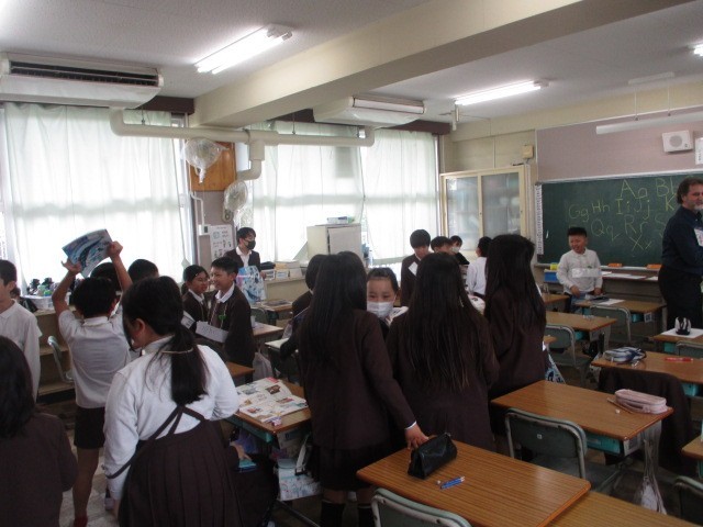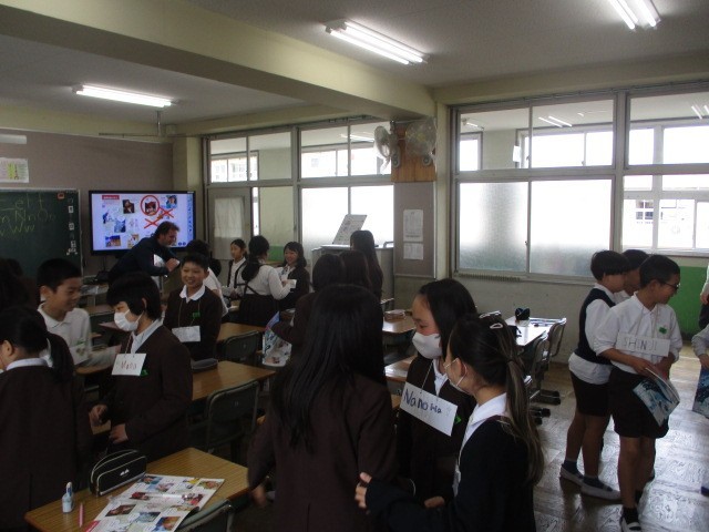 世界のあいさつを勉強しました。そのあと、みんなが知っている「こんにちは」と「ハロー」はなしで、友だちに声をかけて挨拶をします。「ボンジュール」「ニーハオ」「アンニョンハセヨ」色々な国の言葉で「こんにちは」を言い合いました。