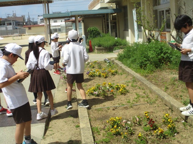 タブレットを持って、4年生は「春みつけ」です。いっぱい春があるでしょう。