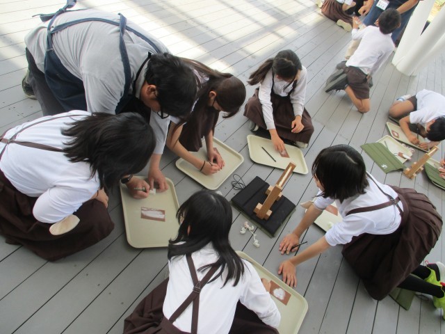 学習館では、勾玉作りをしました。石を削って作っていくのは大変でしたが、自分だけの勾玉を作ることができました。