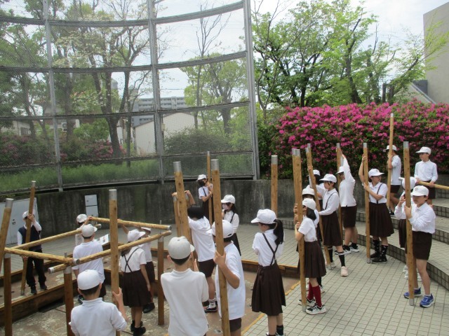 弥生文化博物館では、見学だけでなく、丸太を組み合わせた家造りにも挑戦しました。