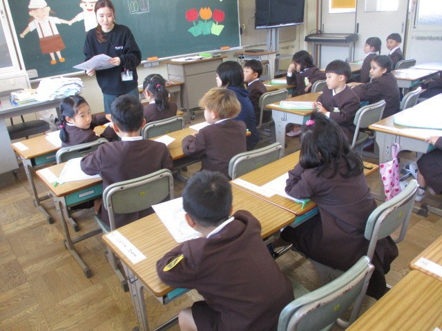 上の会話は、プリントを配る時の言葉です。先生が、「はいどうぞ。」と前の子にプリン...