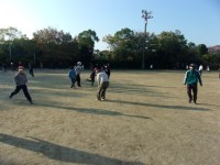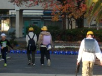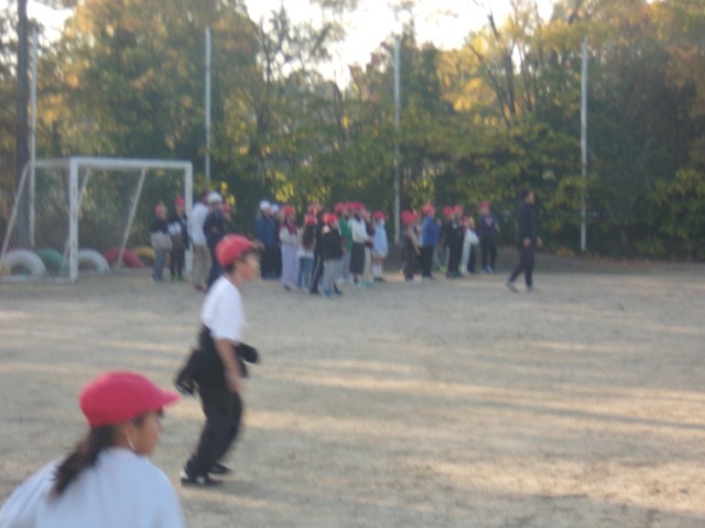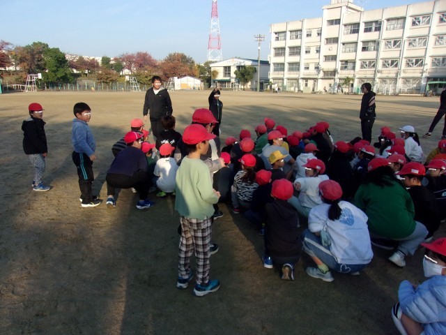 今朝は、いつもと違います。運動場では、天美西小版逃走中が行われました。