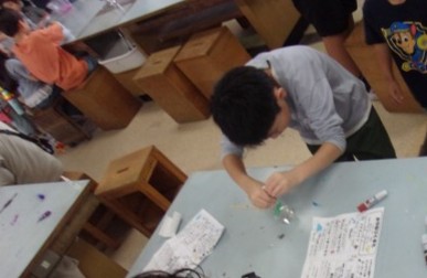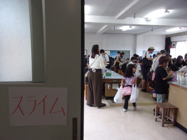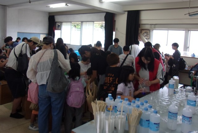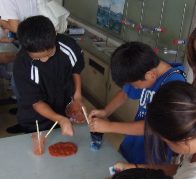 理科室では「スライムづくり」です。子どもたちは好みの色を選び、わくわくしている表情で化学反応を楽しんでいました。