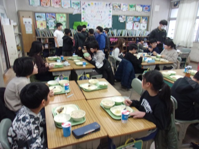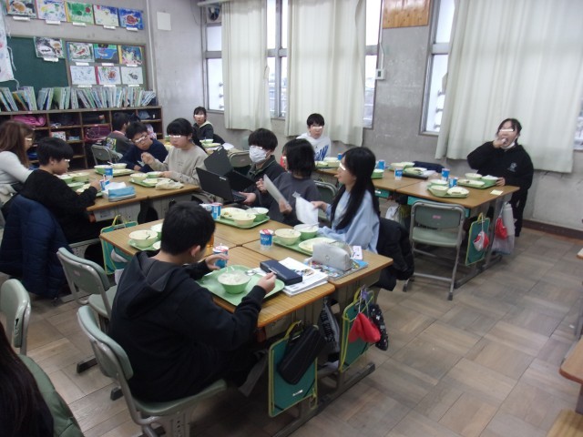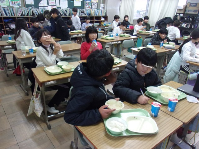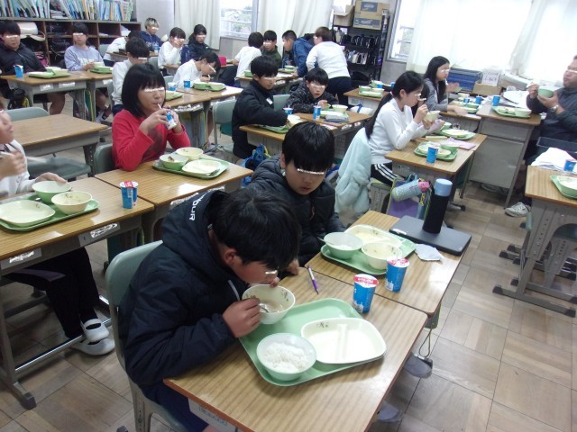 三学期最初の給食です。5年生しっかり噛んで楽しく食べています。