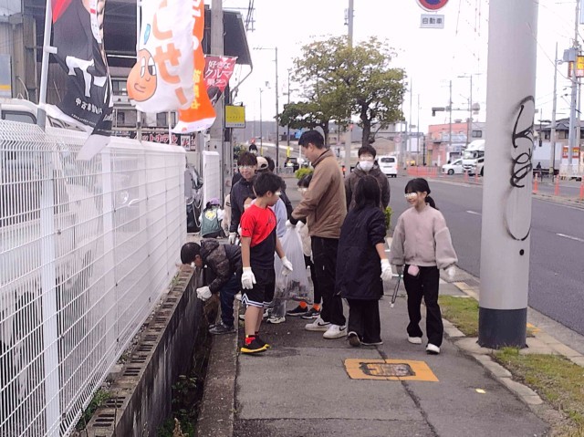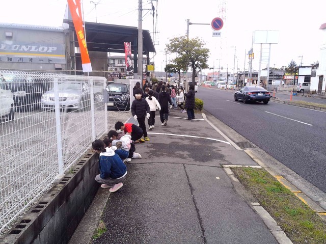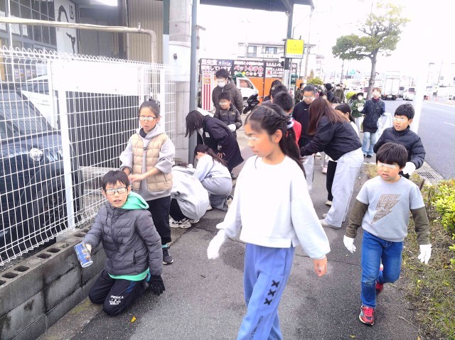 学校から北と南にわかれて、道沿いに落ちているゴミを拾ってくれています。
