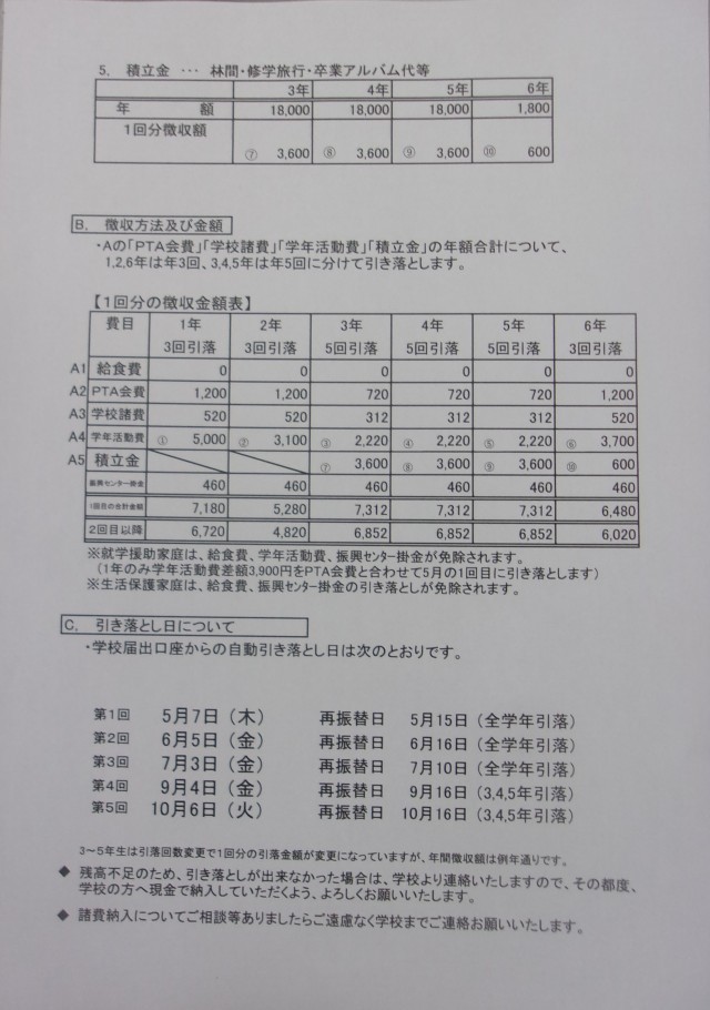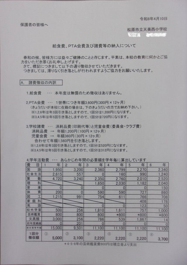 給食費、PTA会費及び諸費等について