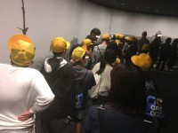 ボランティアの方々から、平和公園にある石碑などの詳しい説明を真剣に聞いています。
