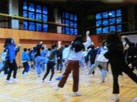 多目的ホールに集まり、朝の集いです。踊ったり、歌ったり、頭の体操したりと盛りだく...
