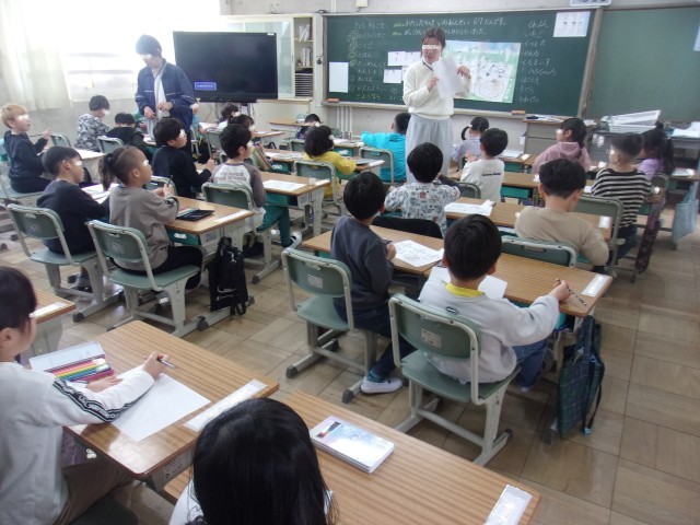 1年2組へ行きました。先生のお話をしっかり聞くことができています。えらい。