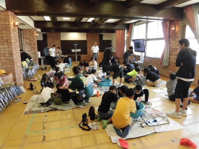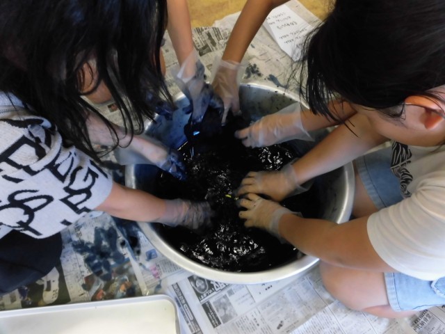 今日の交流内容は「染め物」。数人のグループで布を染料に入れて染め物体験をしました。