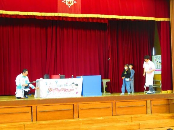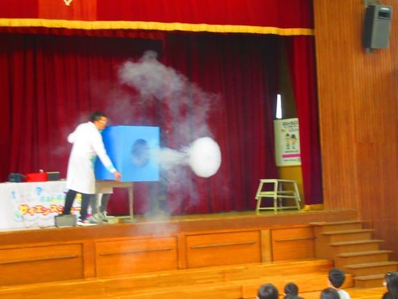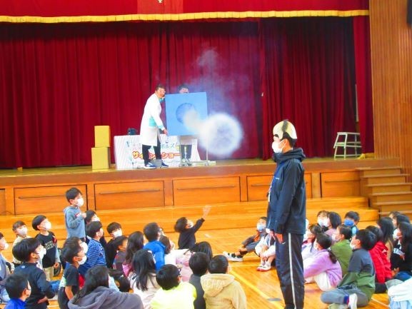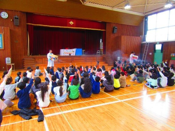 全校が体育館に集まり、「水の色の変化」「空気の流れ」など面白おかしく、それでいて科学への扉を開く大変興味深い時間でした。